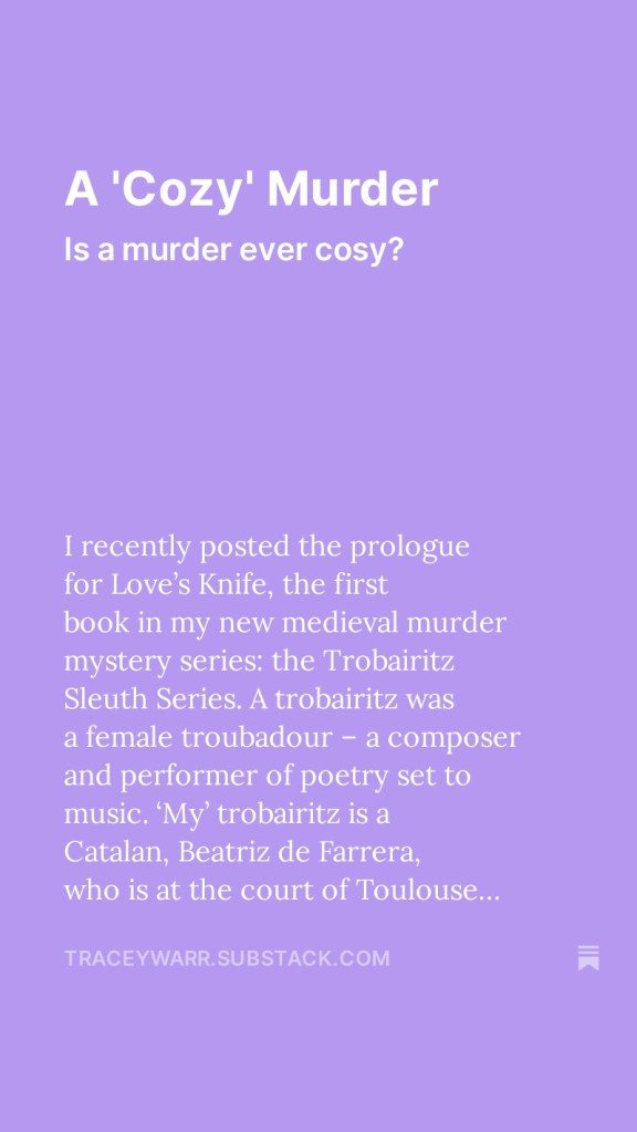 You can read the prologue to my new novel, Love’s Knife, as a free subscriber to my Substack. Starting this month, I will be posting a chapter a week for paying subscribers (who also receive their choice of a free paperback or ebook when it is completed). The novel is the first book in the Trobairitz Sleuth series. It will be published on 3 September 2024 and will be available on preorder soon.